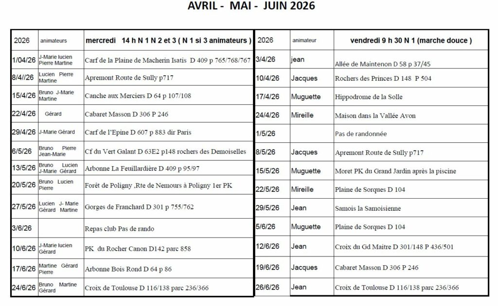 | février | Vendredi 13h30 | SAMOREAU Parking de la Grange aux Dîmes |
